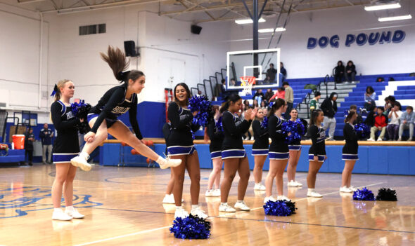 Cheerleader Maddison Allen took to the air at a recent Bulldogs basketball game. (Photo by Jyoti Miller)