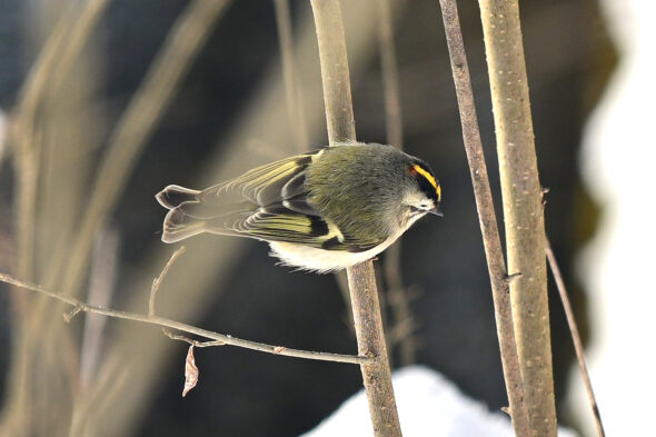 A golden-crowned kinglet tries to stay warm in Glen Helen. This species can be identified by a bright yellow strip on top of the head. (Photo by Kathleen Galarza)