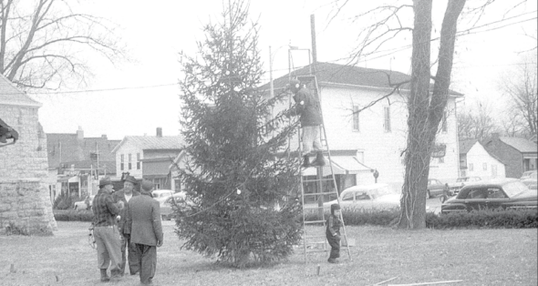 Dec. 1957: COMMUNITY CHRISTMAS TREE erected on the Presbyterian Church lawn Saturday, Dec. 14 at the direction of Community Council. (YS News archive photo)