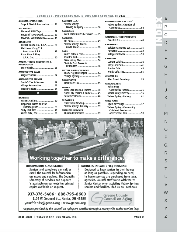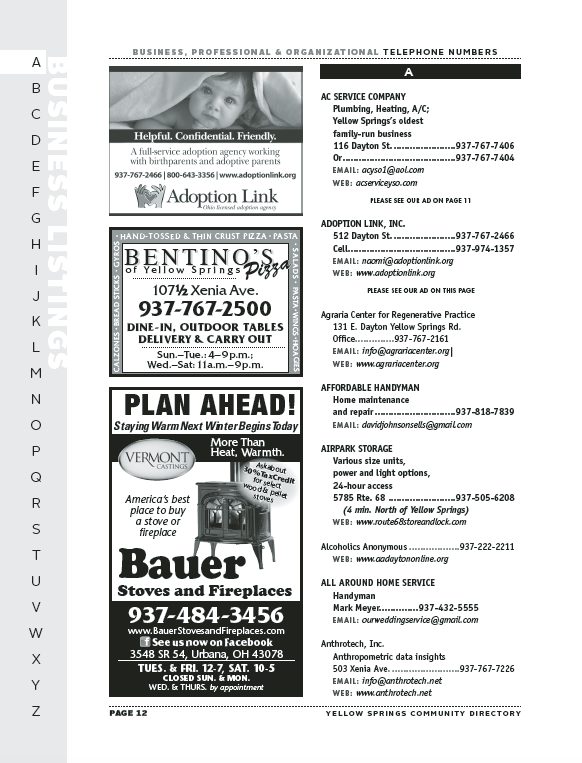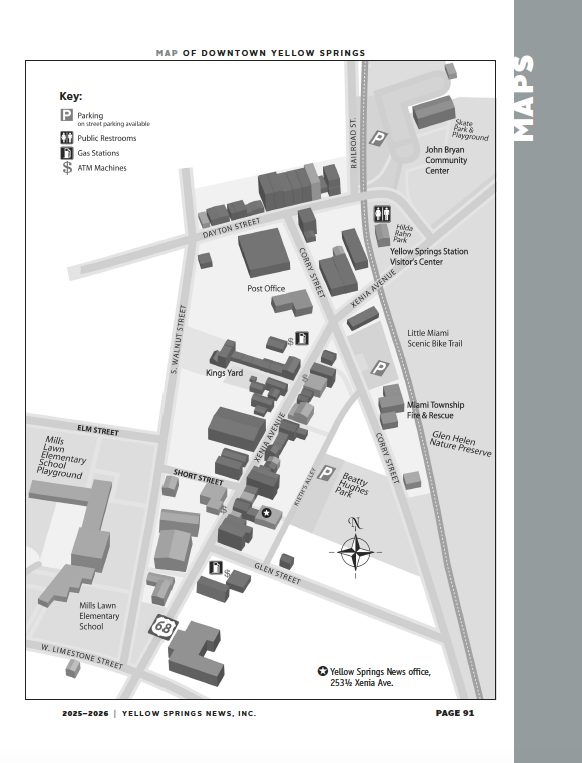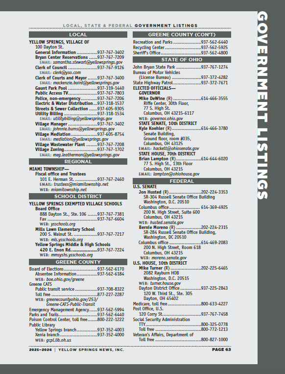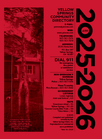 The Yellow Springs Community Directory, aka, the ‘Redbook,’ with businesses & organizations in the front half, a government contact page, and residential phone numbers and maps in the back half.