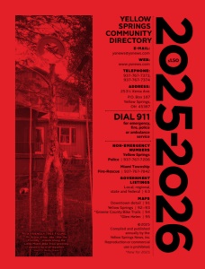 $ 1.50 2o25 - 2o26 Yellow Springs community directory E-mail: ysnews@ysnews.com Web: www.ysnews.com telephone: 937-767-7373, 937-767-7374 address: 253½ Xenia Ave. P.O. Box 187 Yellow Springs, OH 45387 Dial 911 for emergency, fire, police or ambulance service Non-emergency numbers Yellow Springs Police | 937-767-7206 Miami Township Fire-Rescue | 937-767-7842 Government listings Local, regional, state and federal | 63 Maps Downtown detail | 91 Yellow Springs | 92–93 *Greene County Bike Trails | 94 *Glen Helen | 95 © 2025 Compiled and published annually by the Yellow Springs News, Inc. Reproduction or commercial use is prohibited. *New for 2025 A friendly Tree figure, Mr. Arbor Vitae, aka “Abe the Friendly,” stands along the Little Miami Bike Trail, greeting passers by in all weather. photo: Reilly Dixon